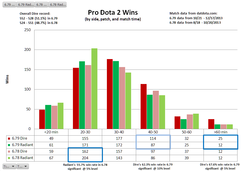Échenle un vistazo a los tiempos de las partidas. La partida más peleada fue la que más duro, que fue la partida de VG contra Fnatic, donde Dire tenía a uno de los más temibles carry del juego: Tiny (+ Wisp). No es que ésto signifique que vas a perder luego de los 30-35 como Radiant, pero nos indica que cada bando en Dota tiene una ventaja por lo asimétrico del mapa: muchos dicen que la ventaja Dire en juegos largos (40+ minutos) se debe a la ventaja Dire para obtener el Aegis Roshan.